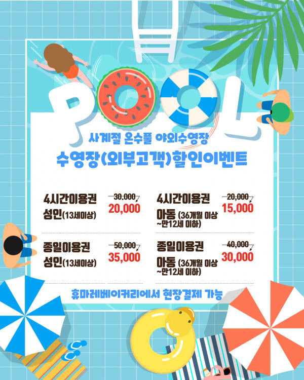 객실고객 외 외부인이 당일 인클로저돔 야외수영장을 사용하실때는 본관내에 휴마레카페에서 인원별로 결제하신 후에 대표자는 신분증을 맡기고, 손목팔찌를 받아 탈의실에서 샤워하신 후 사용하시면 됩니다.