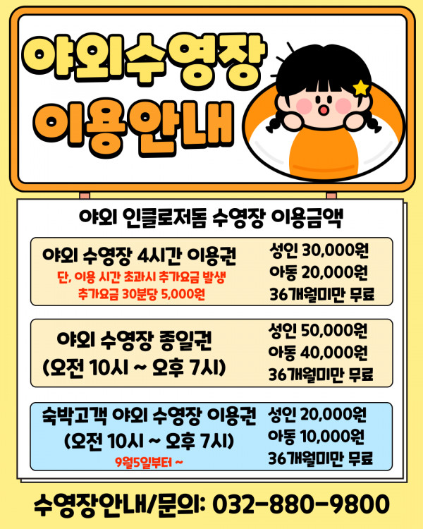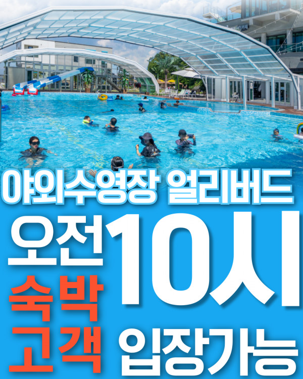 ˙객실예약손님은 수영장 티켓을 받은분들에 한하여 입실전 오후1시부터 사전에 이용하실 수 있으며, 11시 퇴실후 오후1시까지 야외수영장을 이용하실수 있는 특혜를 드립니다.