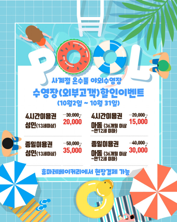 객실고객 외 외부인이 당일 인클로저돔 야외수영장을 사용하실때는 본관내에 휴마레카페에서 인원별로 결제하신 후에 대표자는 신분증을 맡기고, 손목팔찌를 받아 탈의실에서 샤워하신 후 사용하시면 됩니다.