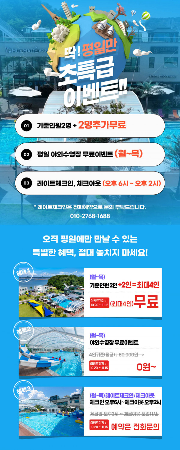 ˙객실예약손님은 수영장 티켓을 받은분들에 한하여 입실전 오후1시부터 사전에 이용하실 수 있으며, 11시 퇴실후 오후1시까지 야외수영장을 이용하실수 있는 특혜를 드립니다.
